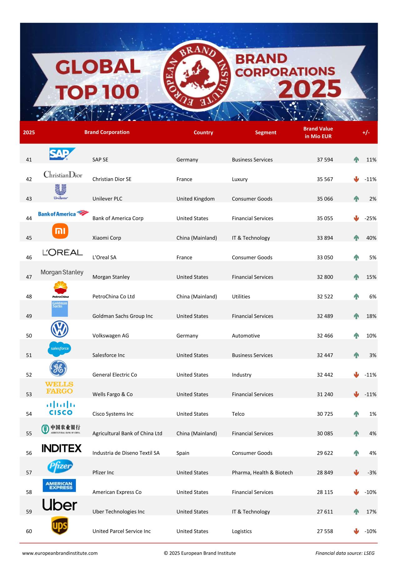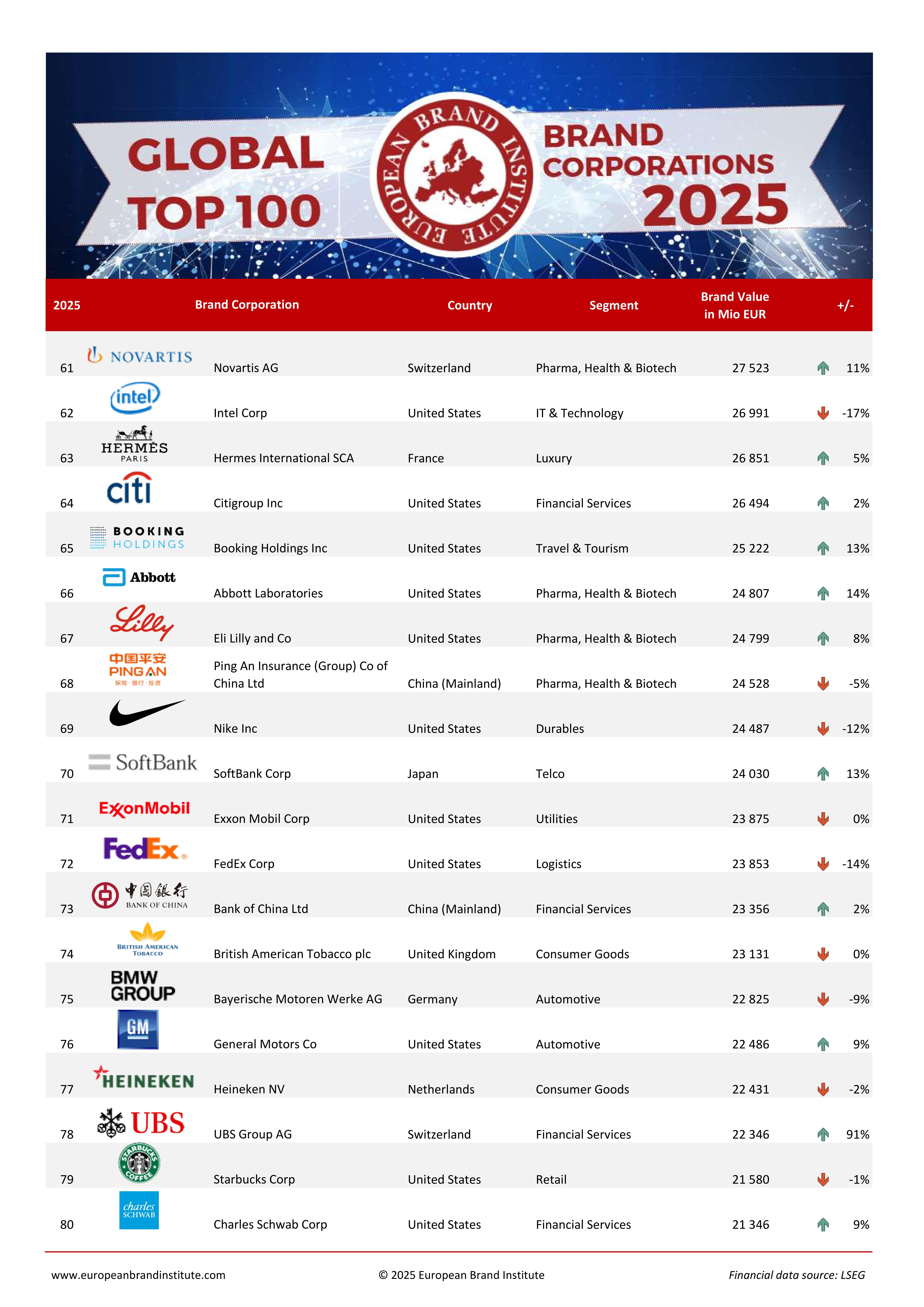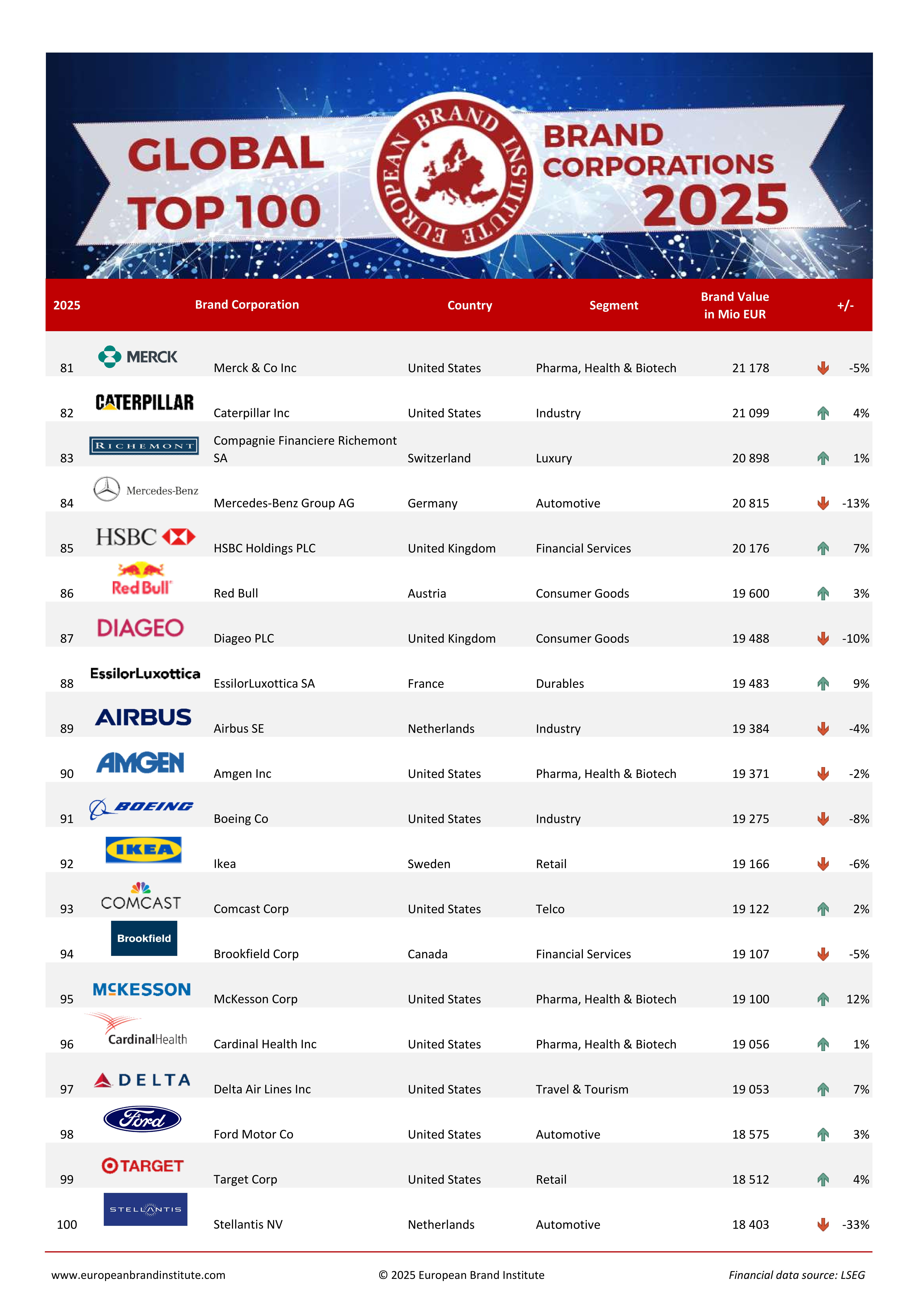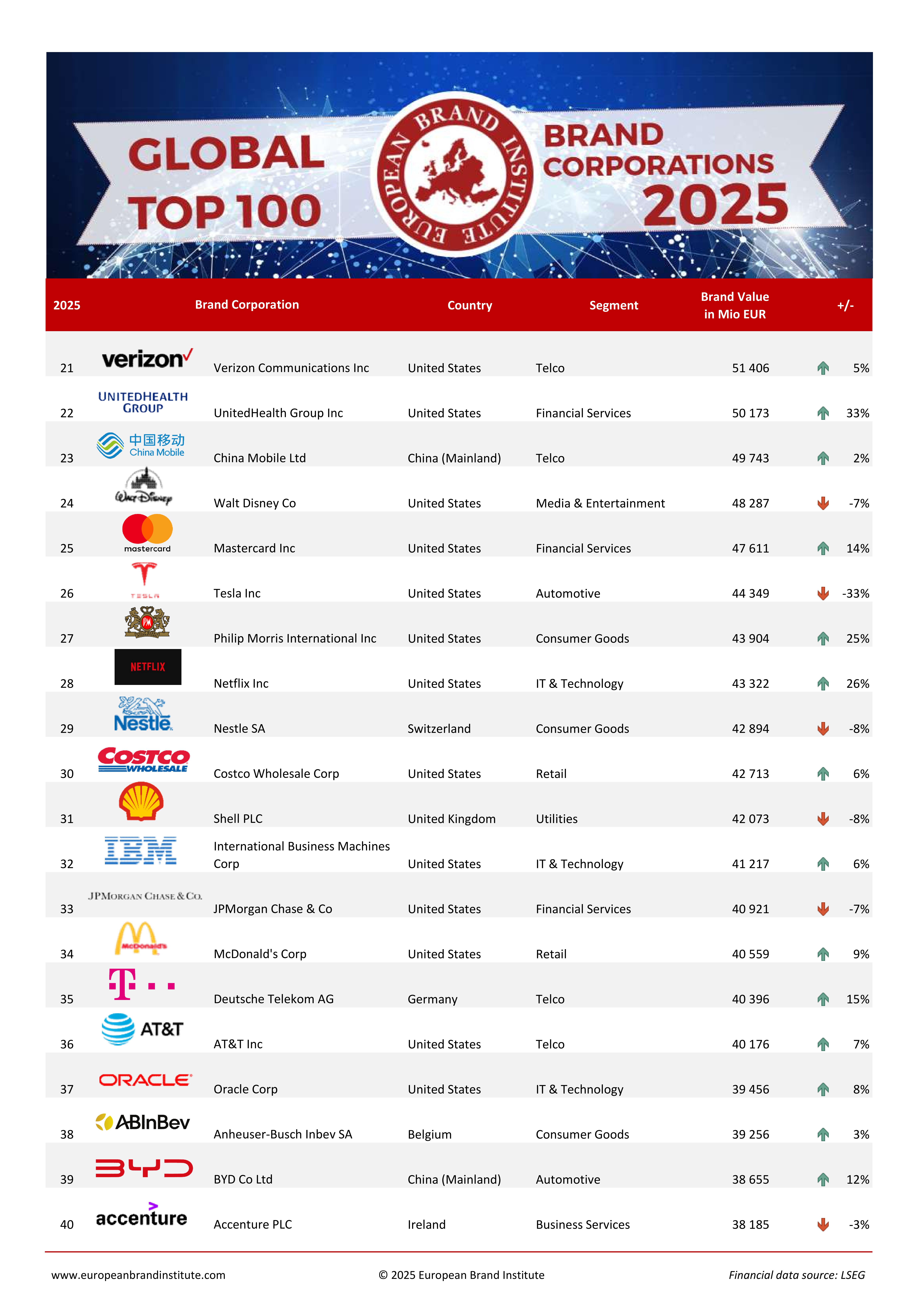 欧洲品牌呈现结构性分化。路威酩轩集团(LVMH)虽仍是欧洲最具价值品牌,但排名下滑至全球第7位,品牌价值下降13.9%。德国电信(Deutsche Telekom)(+14.6%)与思爱普(SAP)(+11.0%)则凭借数字化转型实现逆势增长。奥地利红牛(Red Bull)以196亿欧元品牌价值位列第86位,是欧洲中坚品牌的代表。